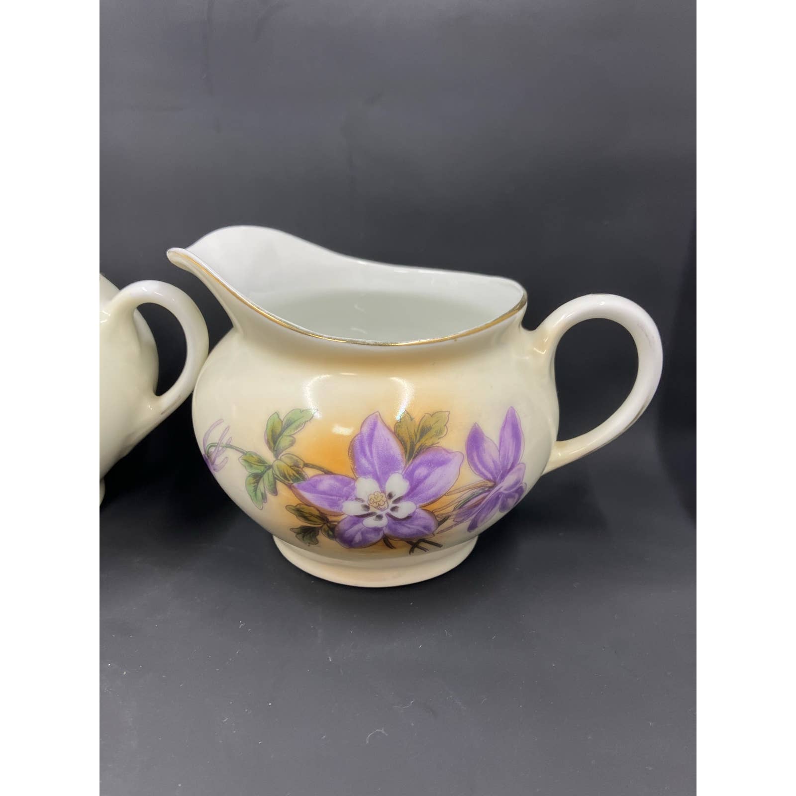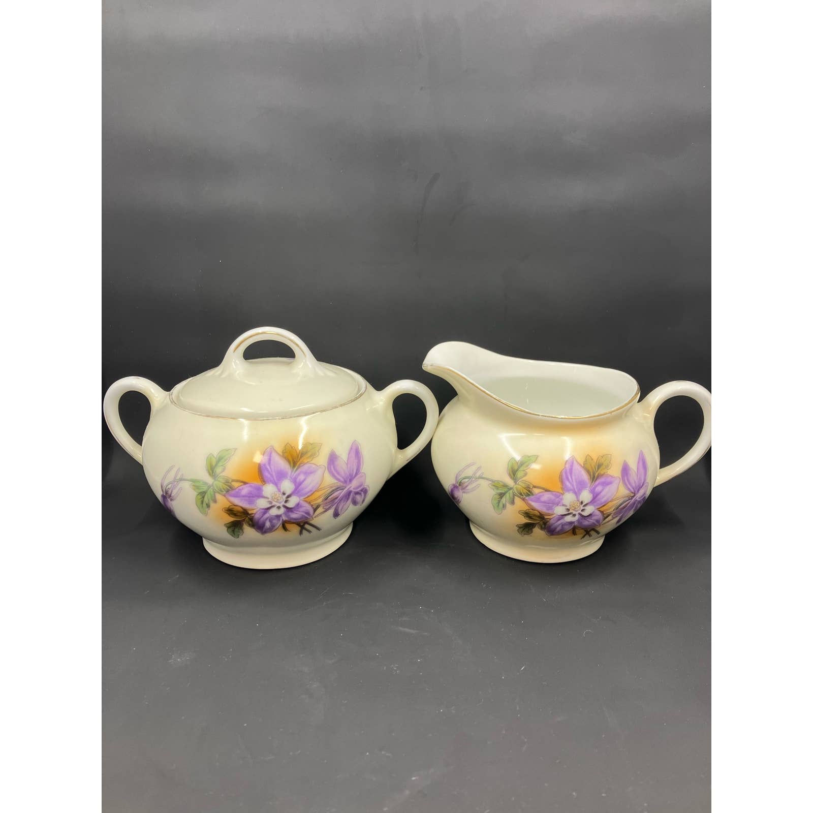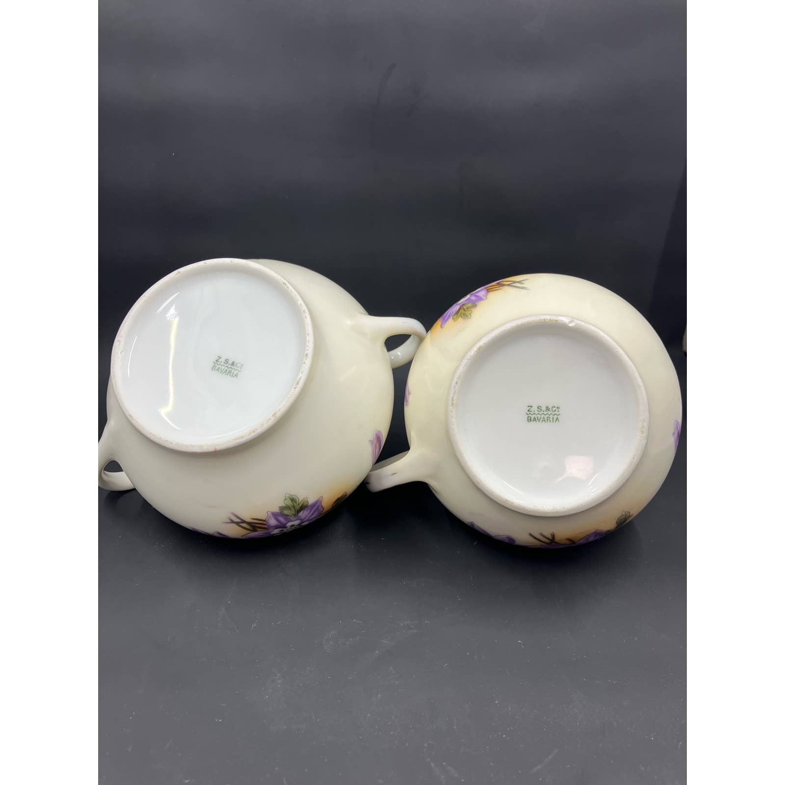 Antique Zeh Scherzer & Co ZS&Co Sugar and Creamer Set Vivid colors of violet flowers, green foliage on a light tan background Trimmed in Gold. Circa 1880-1918. Made in Bavaria.