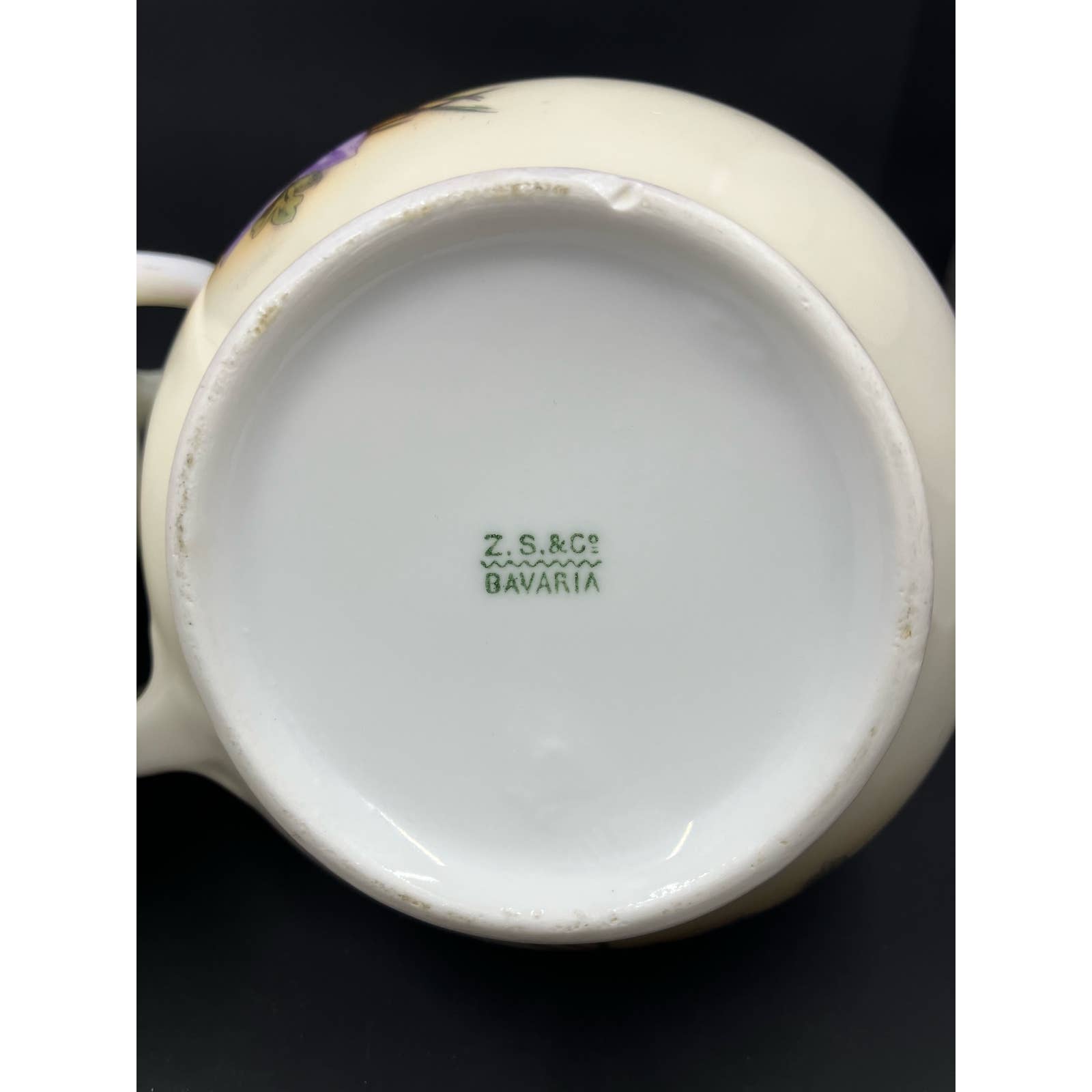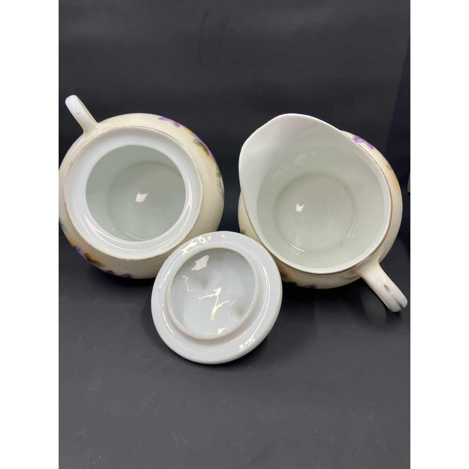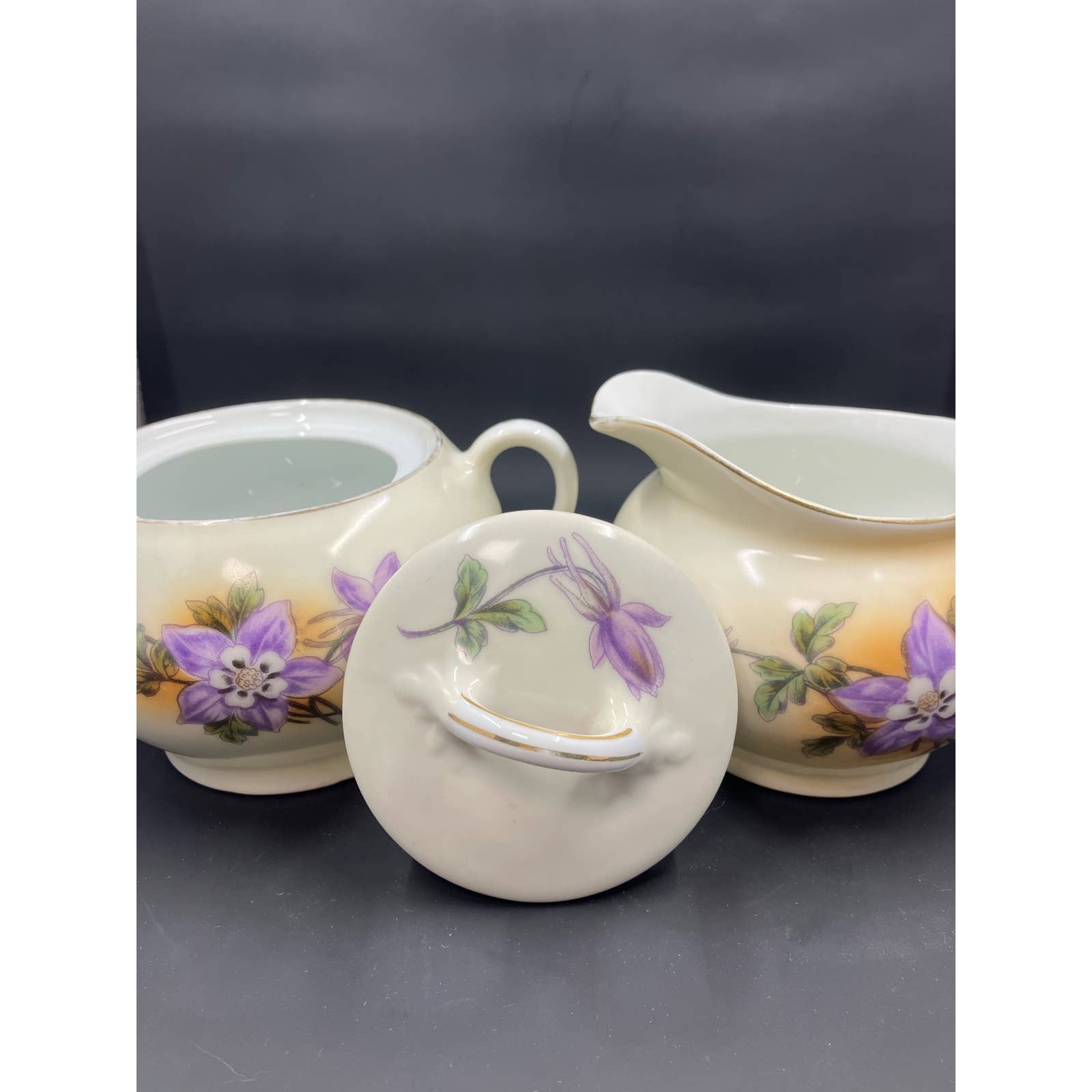 Antique Zeh Scherzer & Co ZS&Co Sugar and Creamer Set Vivid colors of violet flowers, green foliage on a light tan background Trimmed in Gold. Circa 1880-1918. Made in Bavaria.