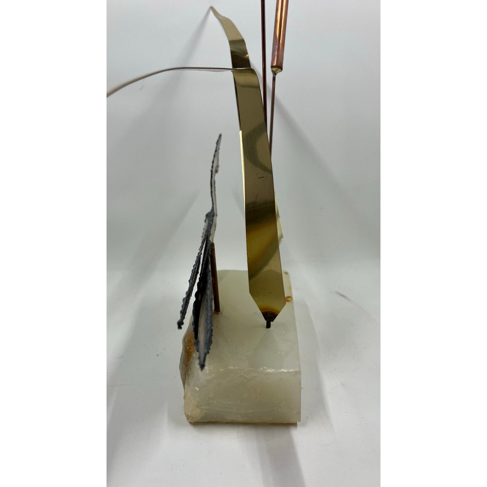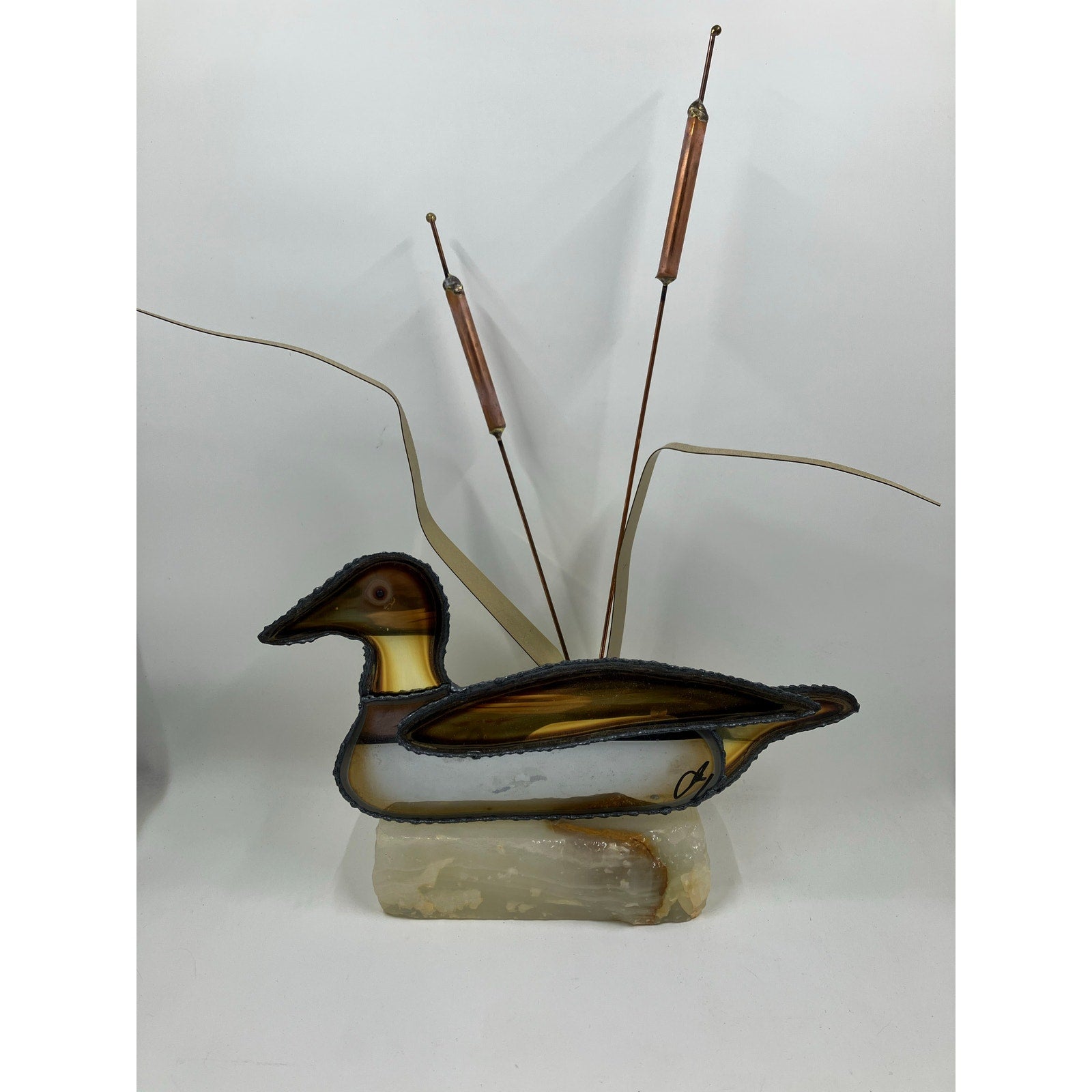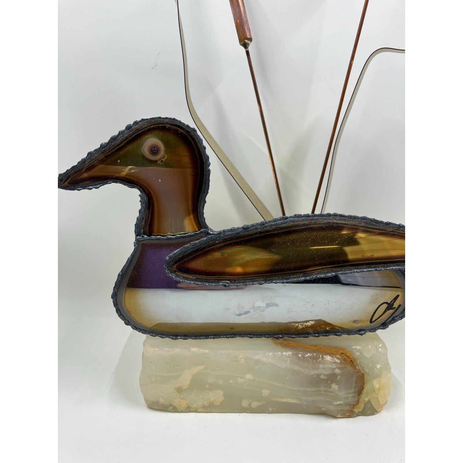 Brutalist Brass and Bronze Duck with Copper Cattails on Onyx Base Signed John DeMott