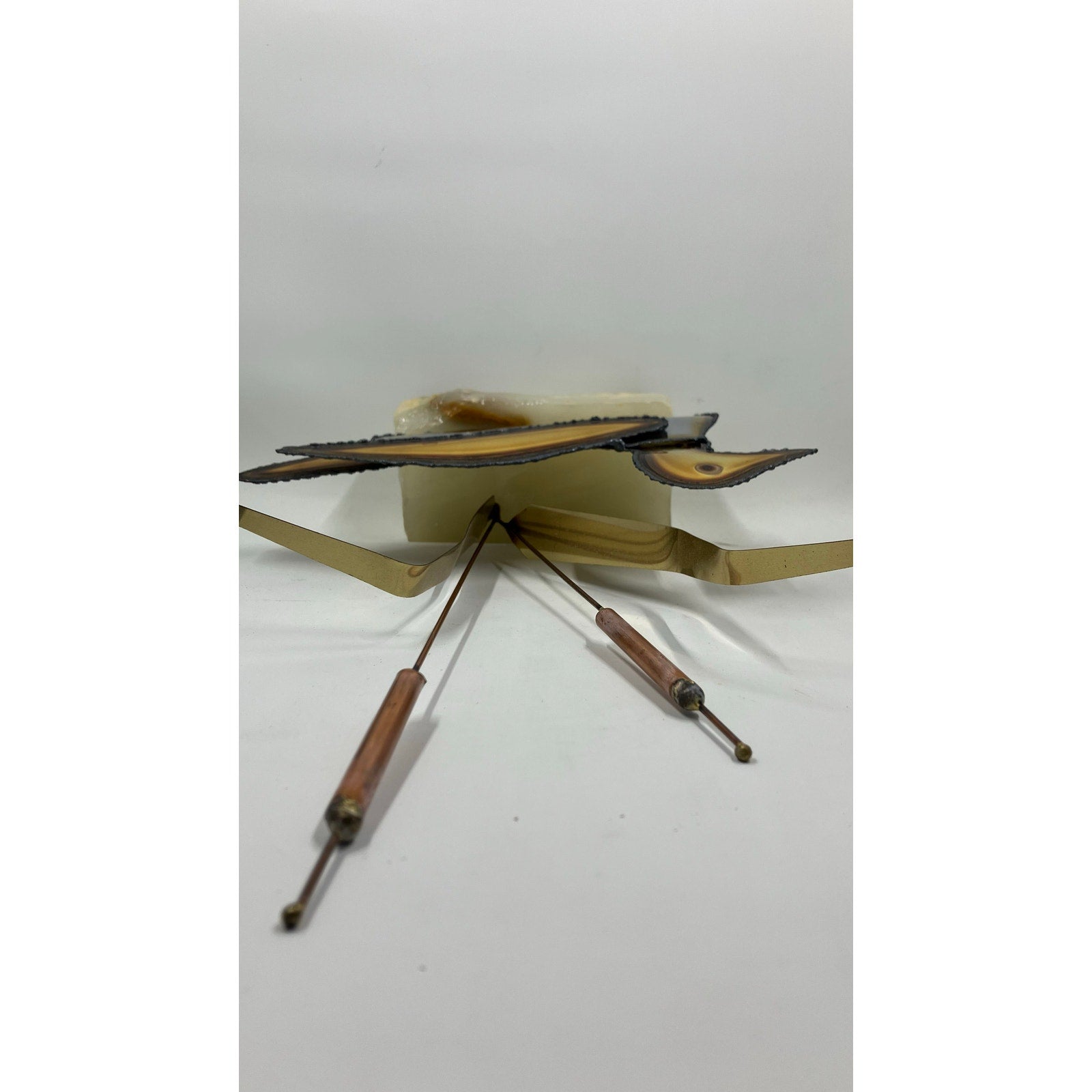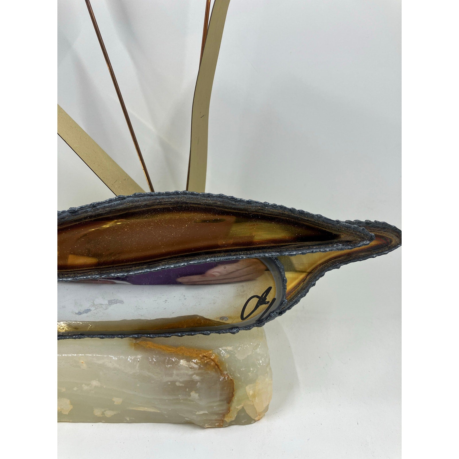 A beautiful brutalist brass copper and bronze duck sculpture on an onyx base. The onyx has a gorgeous deep amber colored vein.