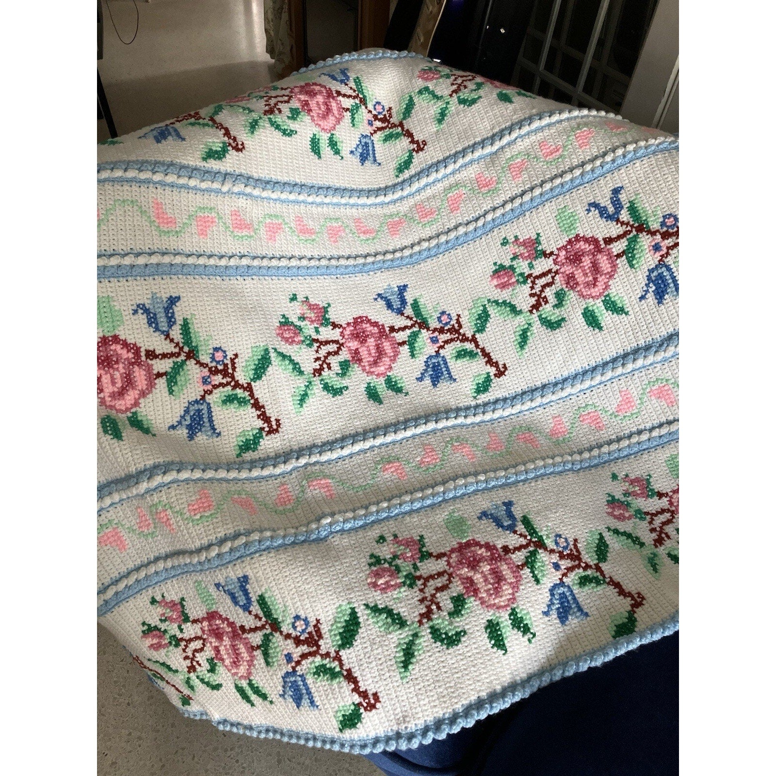 Handmade Tunisian Crochet Afghan Blanket Cross Stitch Floral Rose Theme, 57”x56”