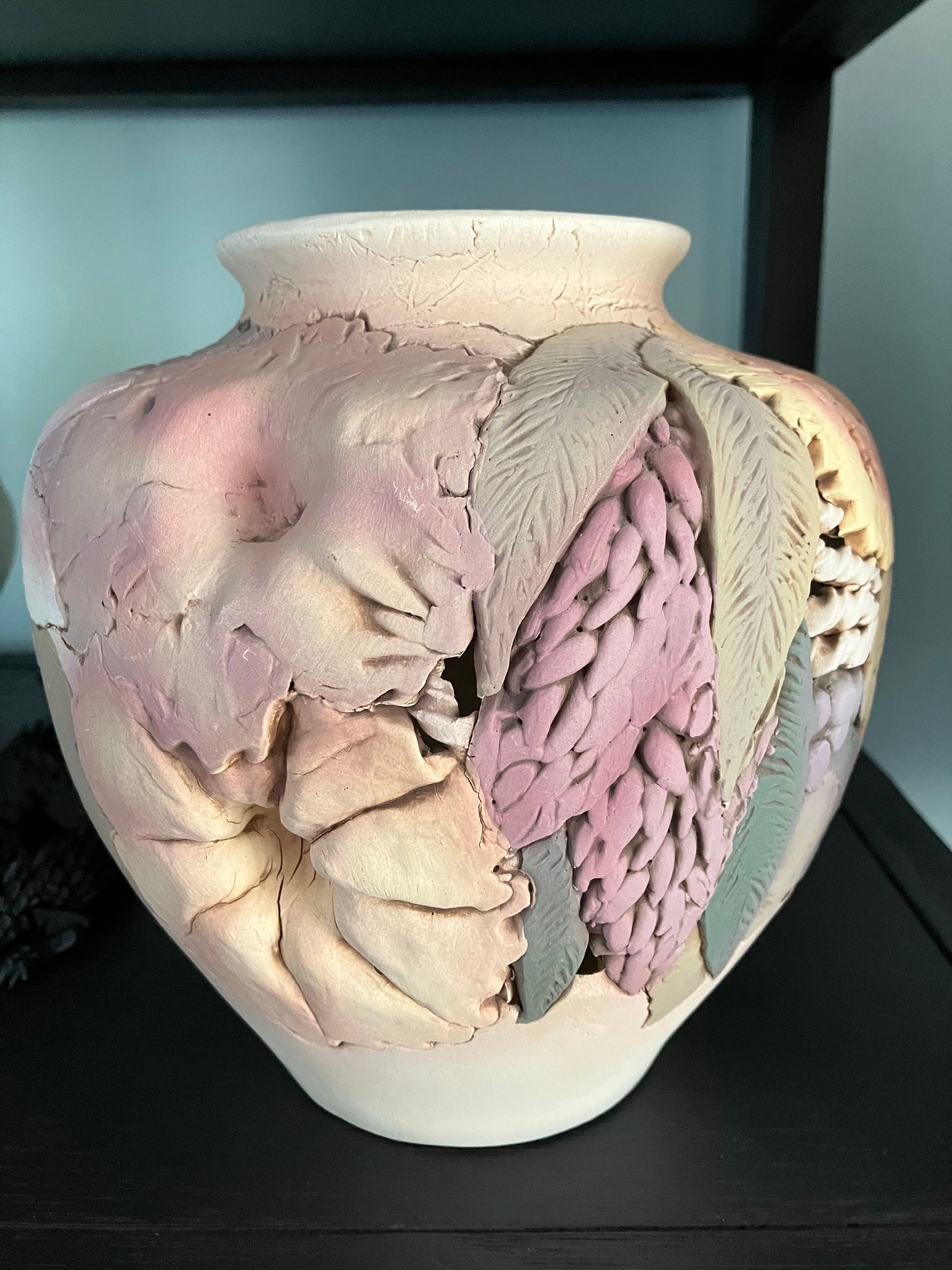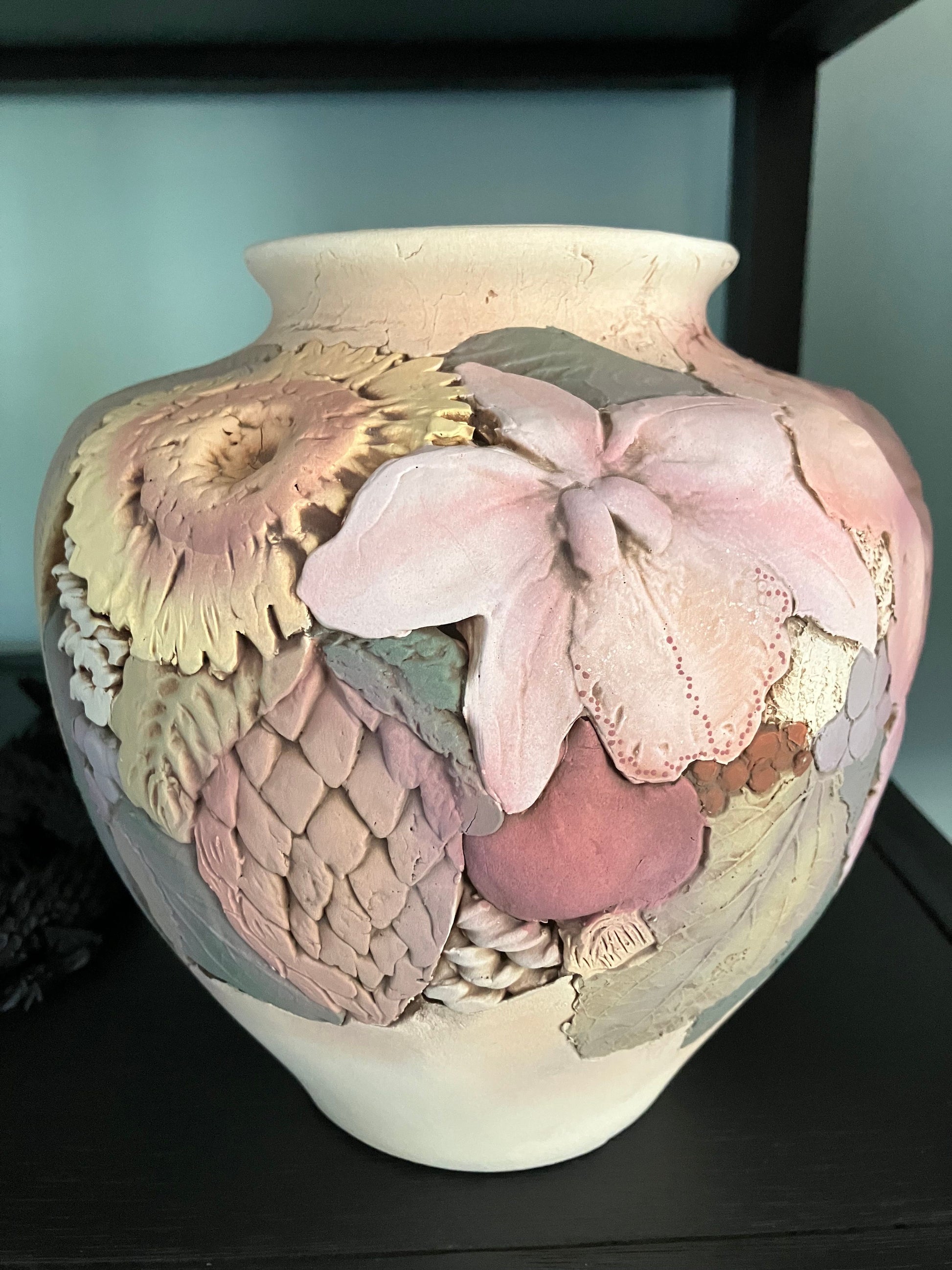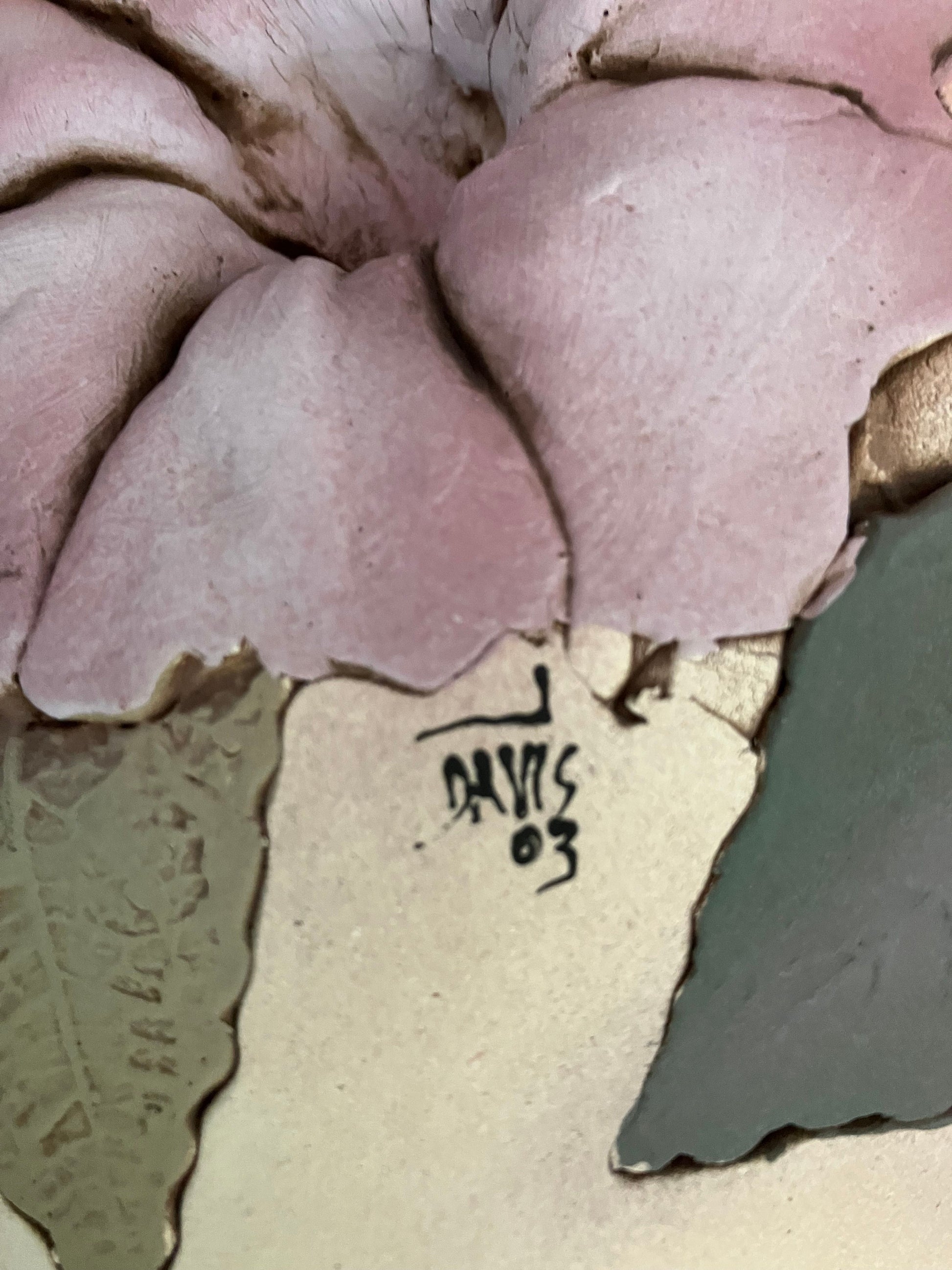 Original Art Clay Vessel Signed by Artist John Davis 8” x 8” Sculpted Inlaid Florals.