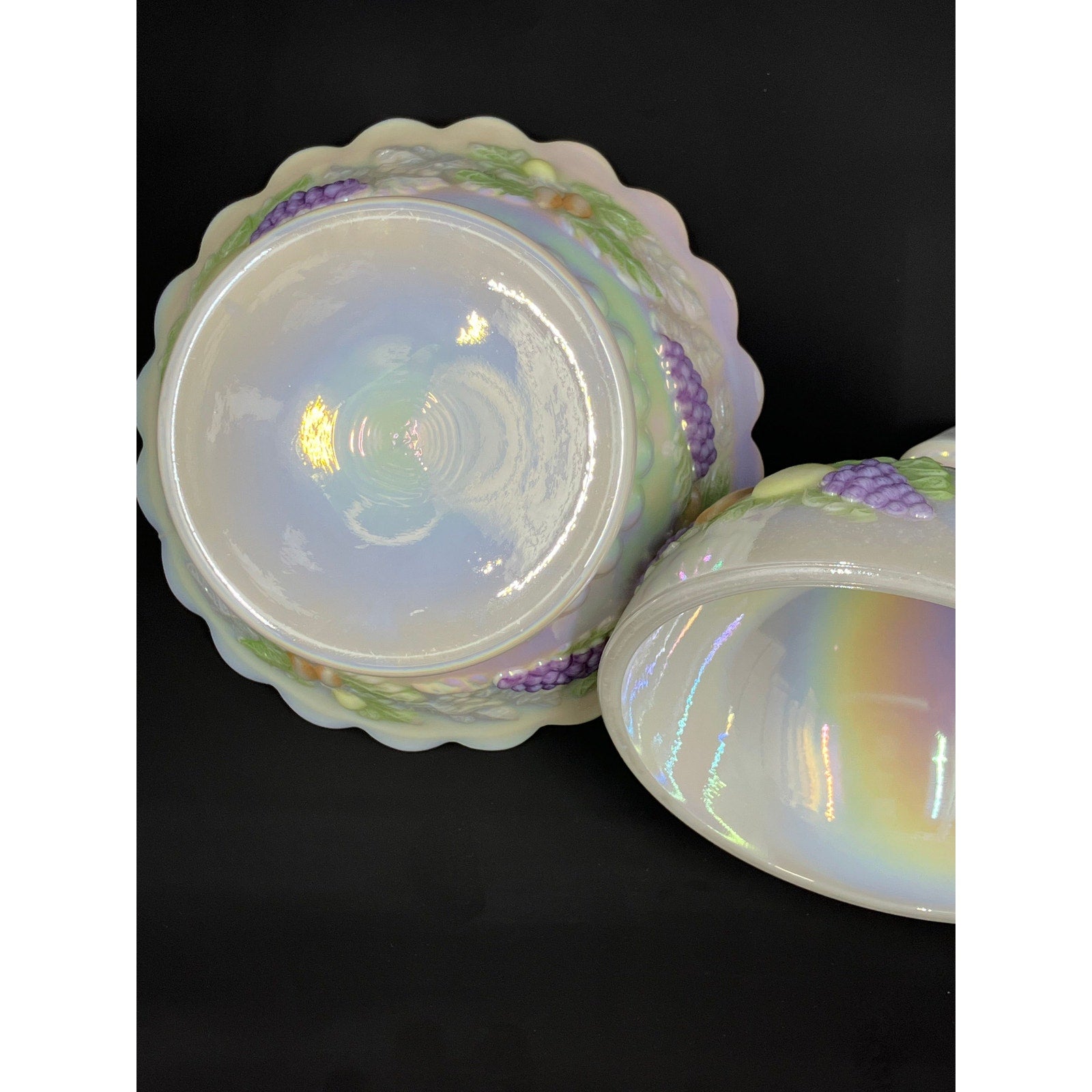 Westmoreland Iridescent Milk Glass Della Robbia Lidded Pedestal Candy Dish 7.25" tall, 5.5" wide